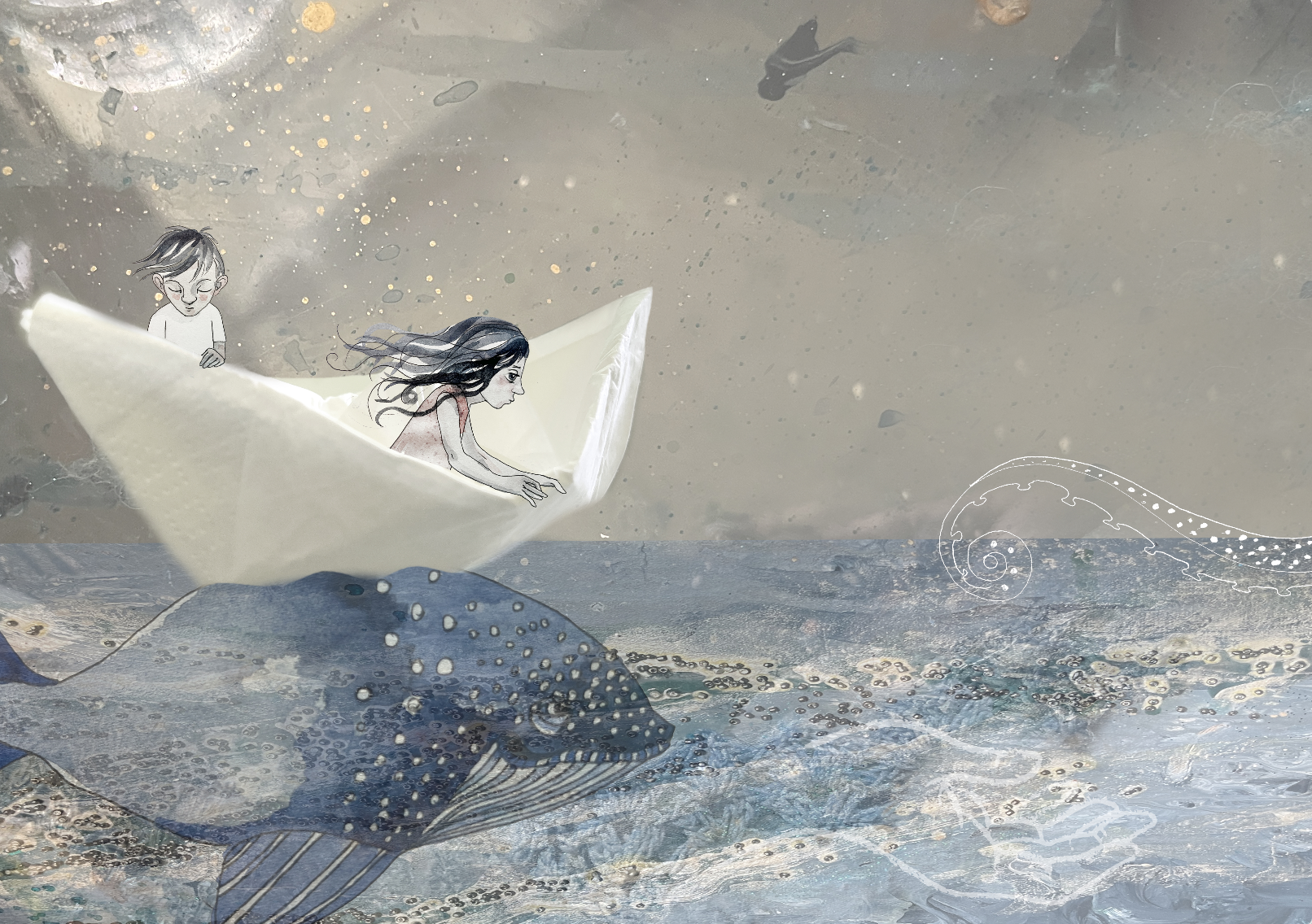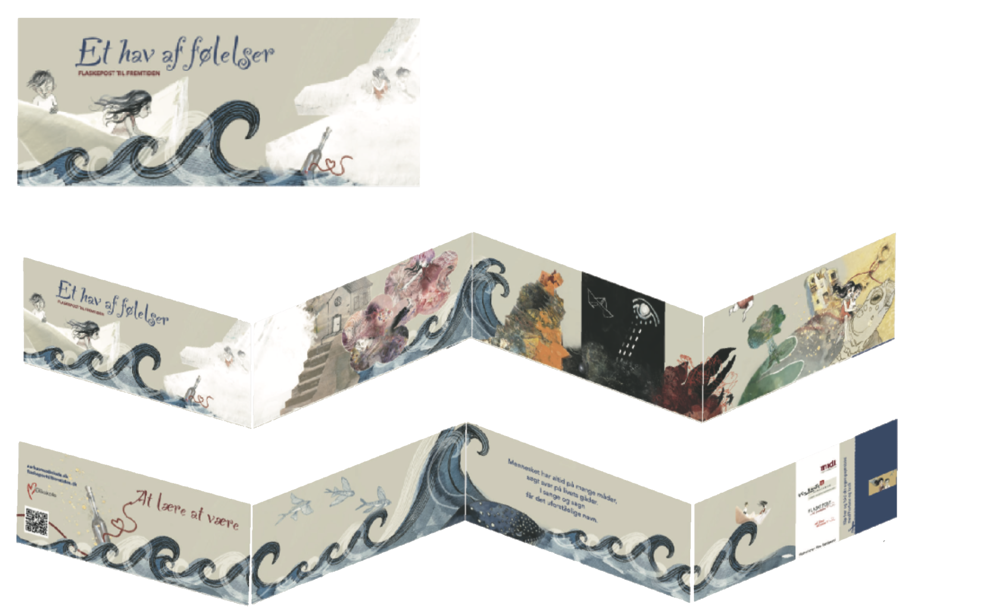 Et samarbejde med Aarhus Musikskole. Oprindelig en billedfortælling om to børns eventyrlige papirbåds-rejse gennem forskellige følelser, under projektet “Flaskepost til fremtiden”. I dag brugt i indskolingen, som plancher til at understøtte bevægelserne, følelserne og musikken i fortællingen.